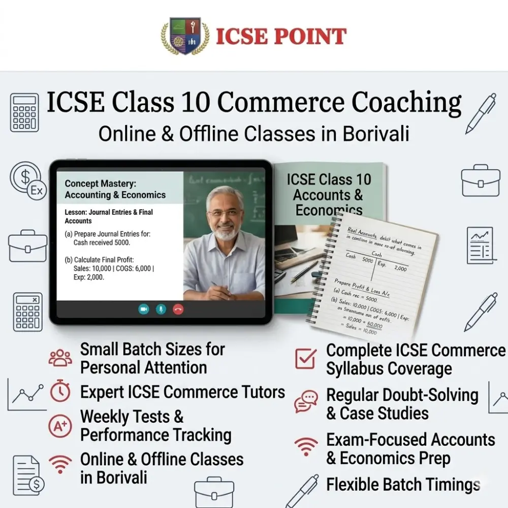Looking for ICSE Class 10 Commerce coaching classes in Borivali? Our expert coaching program helps students master Accounts, Economics, and Commerce concepts with clarity and confidence.